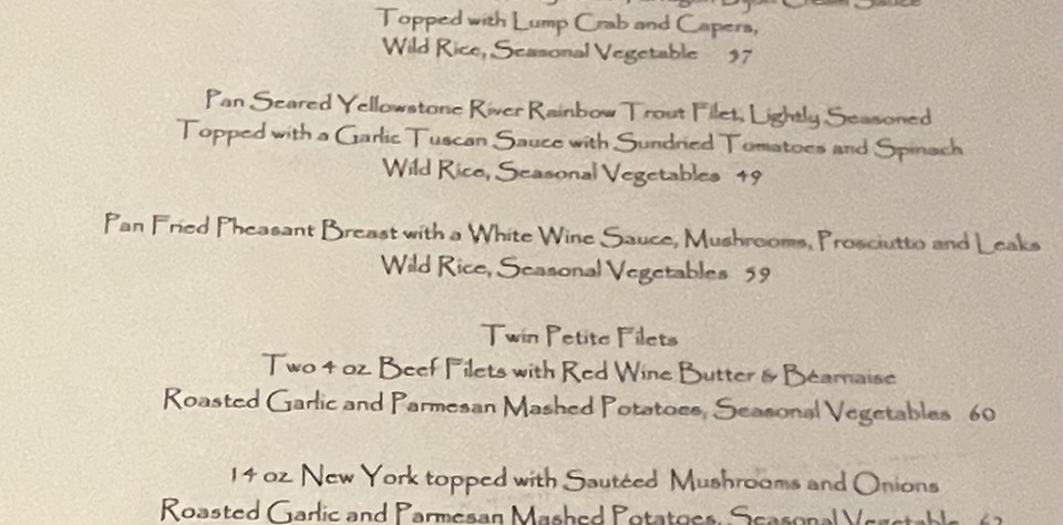 Our culinary team uses many regional ingredients to create a truly delectable menu including hand cut steaks, wild game, fresh seafood and nightly specials.